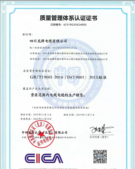 热烈祝贺四川龙牌电缆有限公司取得ISO9001体系认证证书