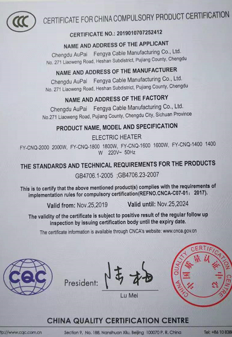 热烈祝贺成都奥派风雅电缆制造有限公司取得CCC认证证书