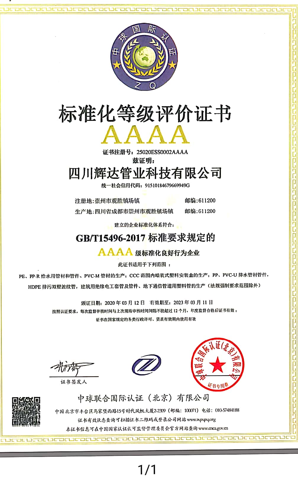 热烈祝贺四川辉达管业科技有限公司取得 标准化等级评价证书