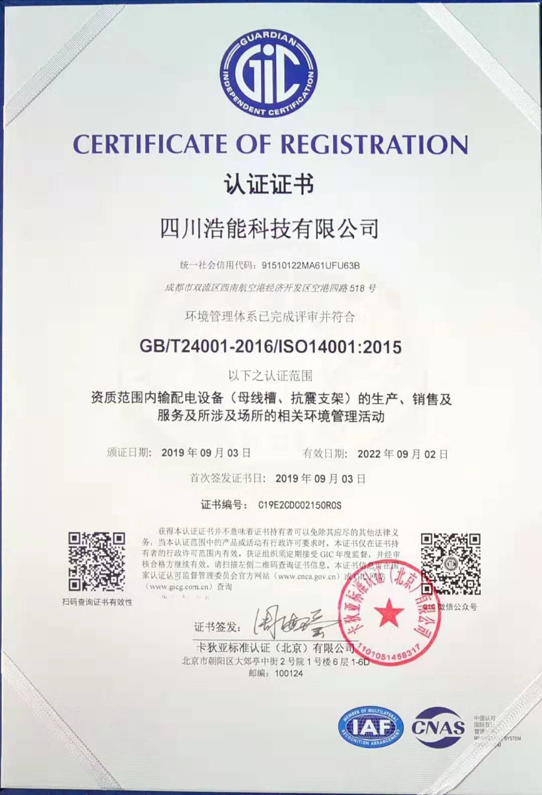 热烈祝贺四川浩能科技有限公司取得三体系ISO9001/1800/1400认证证书