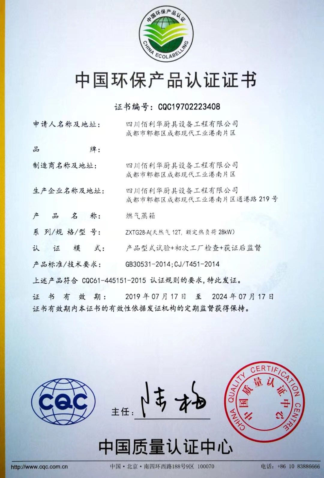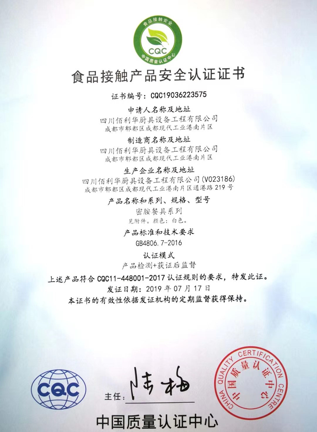 热烈祝贺四川佰利华厨具设备工程有限公司取得食品接触产品安全认证证书、中国环保产品认证证书、中国节能产品认证证书、