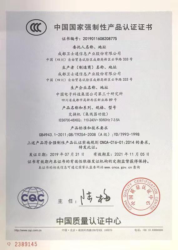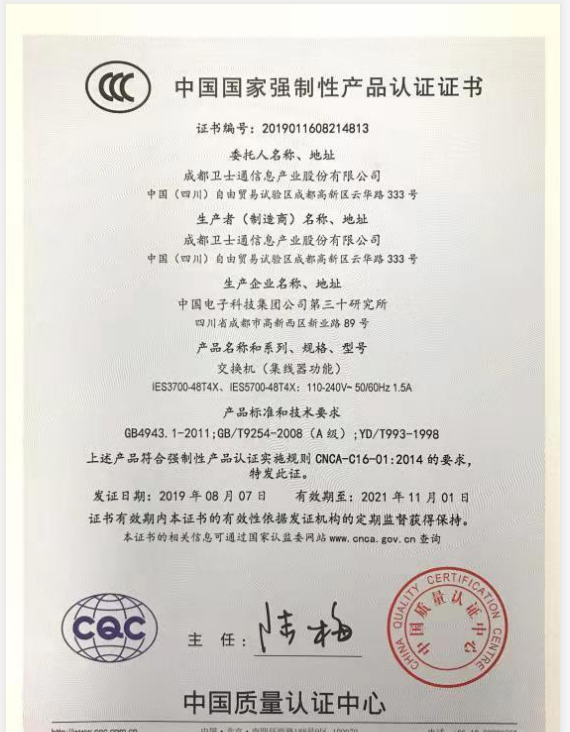 热烈祝贺中国电子科技集团有限公司第三十研究所取得国家强制性产品3C认证证书