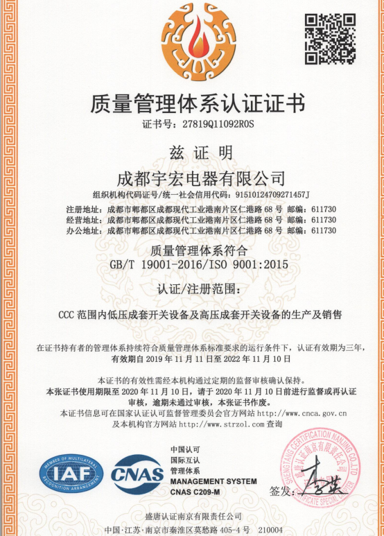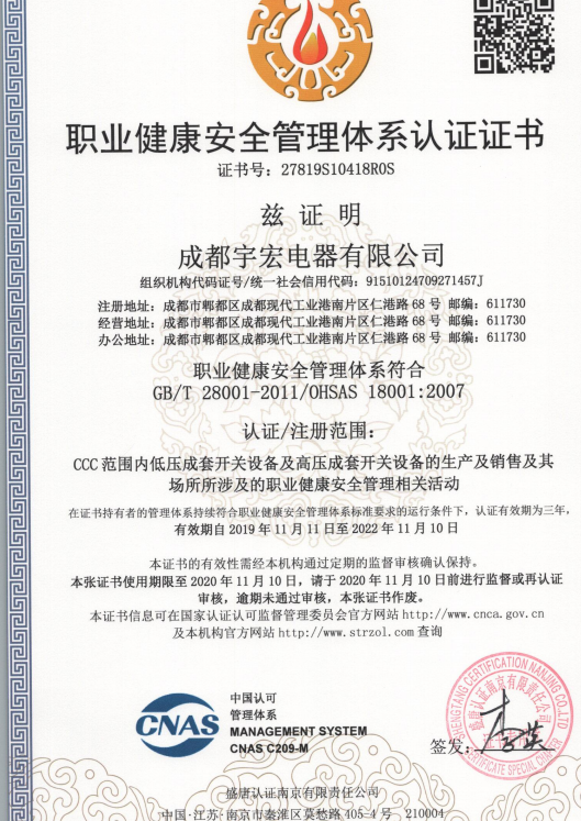 热烈祝贺成都宇宏电器有限公司取得ISO9001/1800/1400/三体系认证证书