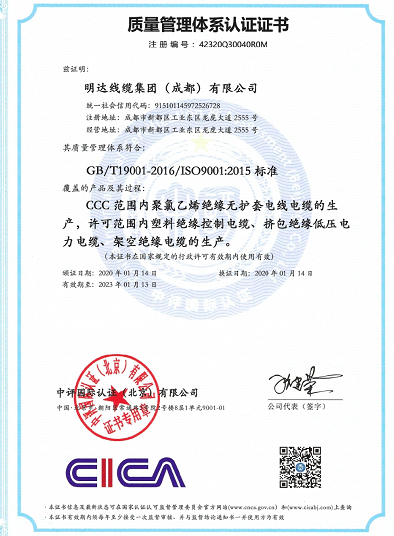 热烈祝贺明达线缆集团(成都)有限公司顺利取得ISO9001/1800/14001/体系认证证书