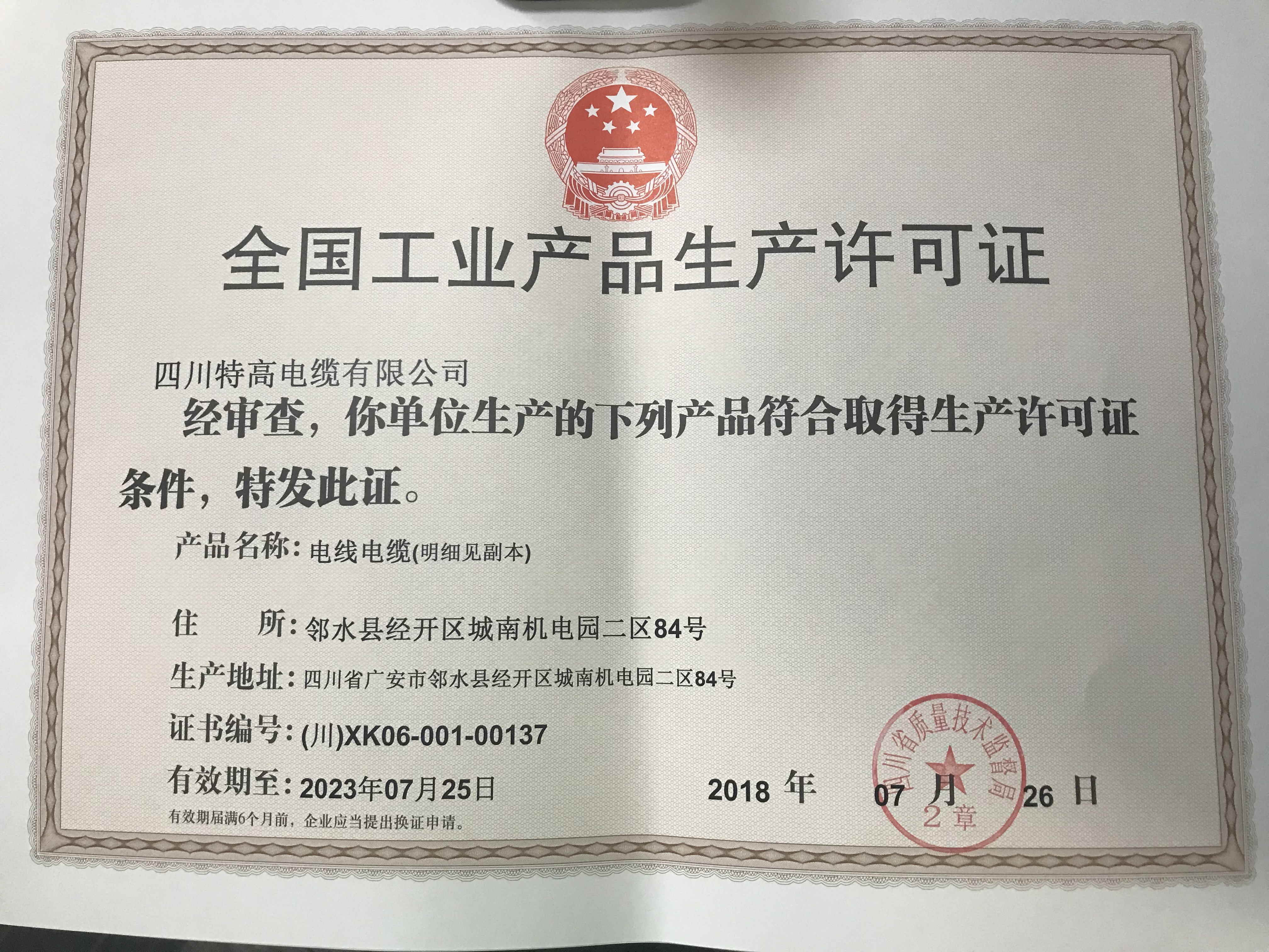 热烈祝贺四川特高电缆有限公司取得生产许可证