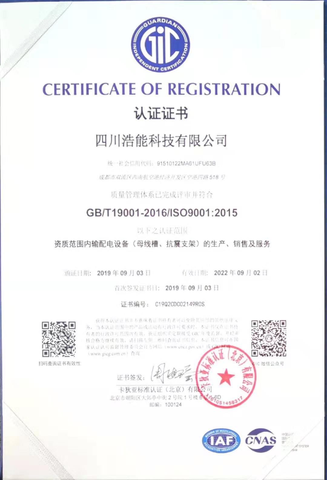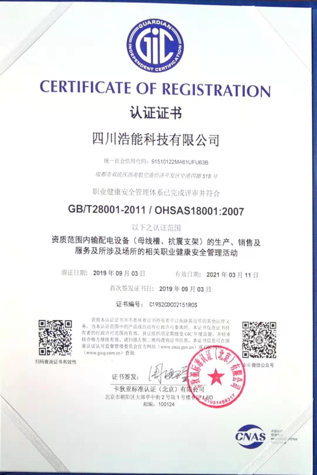 热烈祝贺四川浩能科技有限公司取得三体系ISO9001/1800/1400认证证书