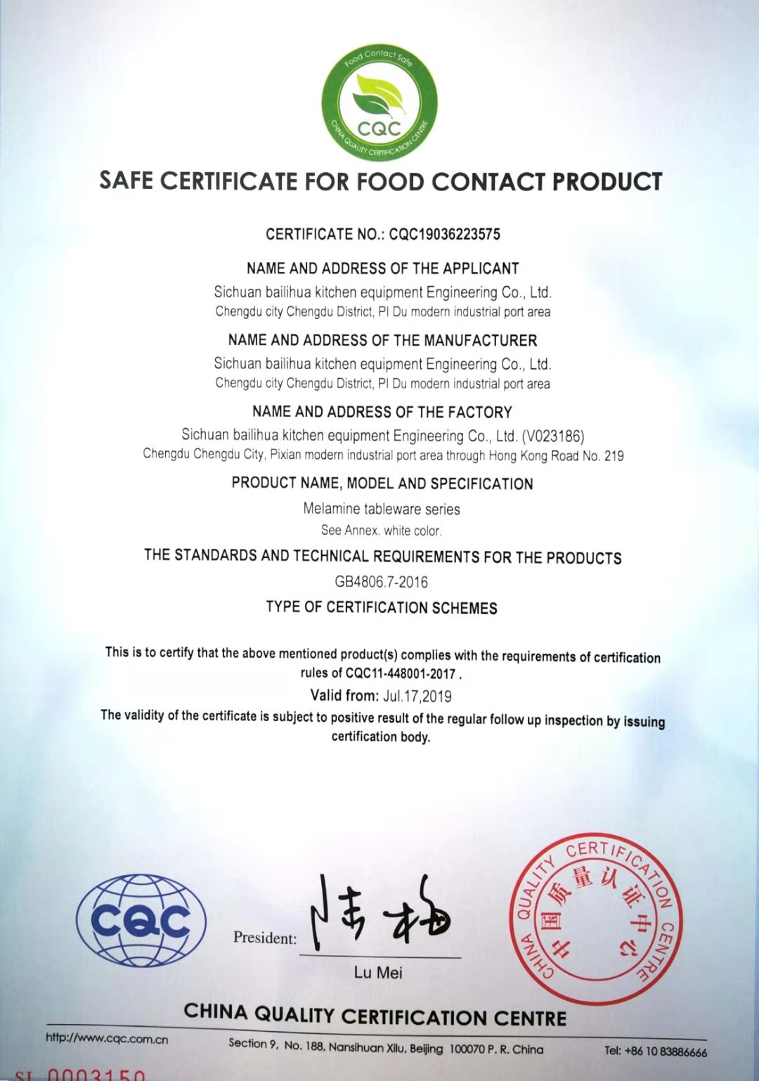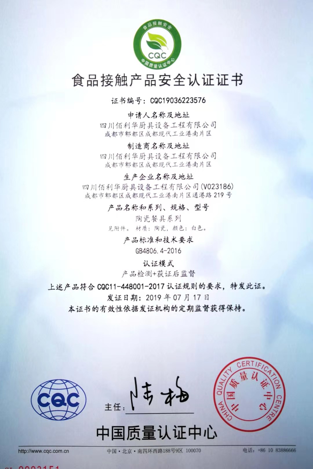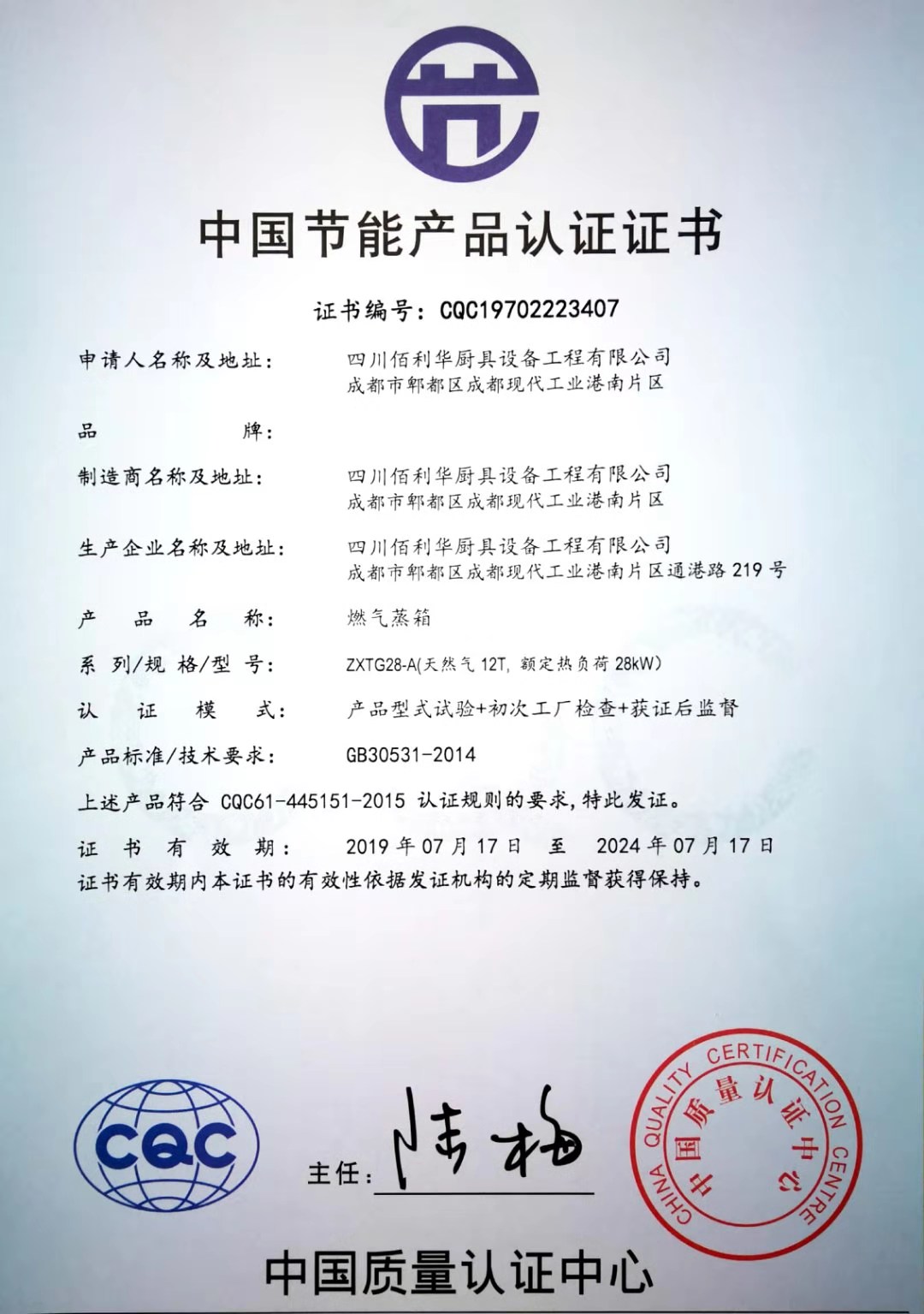热烈祝贺四川佰利华厨具设备工程有限公司取得食品接触产品安全认证证书、中国环保产品认证证书、中国节能产品认证证书、