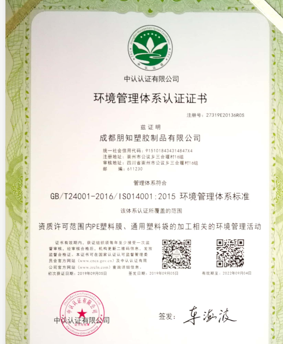 热烈祝贺成都朋知塑胶制品有限公司取得ISO1400认证证书